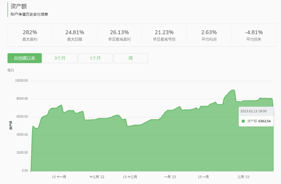 具体到每月的表现上, “EURUSD短线小能手” 的月度回报表现同样可圈可点。其中仅 2022 年 11 月这一月的回报便高达 55.78%。由于 “EURUSD短线小能手” 主要投资欧元/美元的货币对,而今年 2 月有关美联储是否维持鹰派立场的新闻不断,造成美元汇率在短期内频繁上下波动,因此 “EURUSD短线小能手” 在 2 月的回报有所回落。但即便如此,其截止目前的平均每月回报率亦有 28.55% 的亮眼表现。