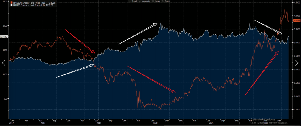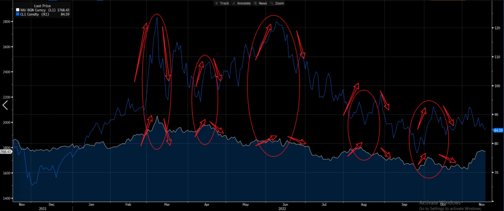 在美元激进加息的通道中,美元价值自然一路飙升。我们通过下图便可看出,今年以来的金价走势基本随着美元升值而逐步走低。但是,11 月 10 日美国最新公布的 CPI 数据不及预期,透露出一股美国当前通胀或已发生好转的曙光。在这一预期下,市场重燃美联储或即将放缓加息步伐的希望,黄金价格又转而走高。