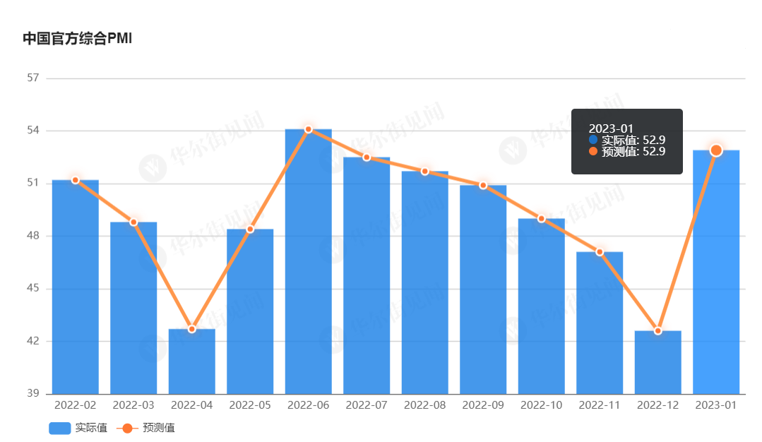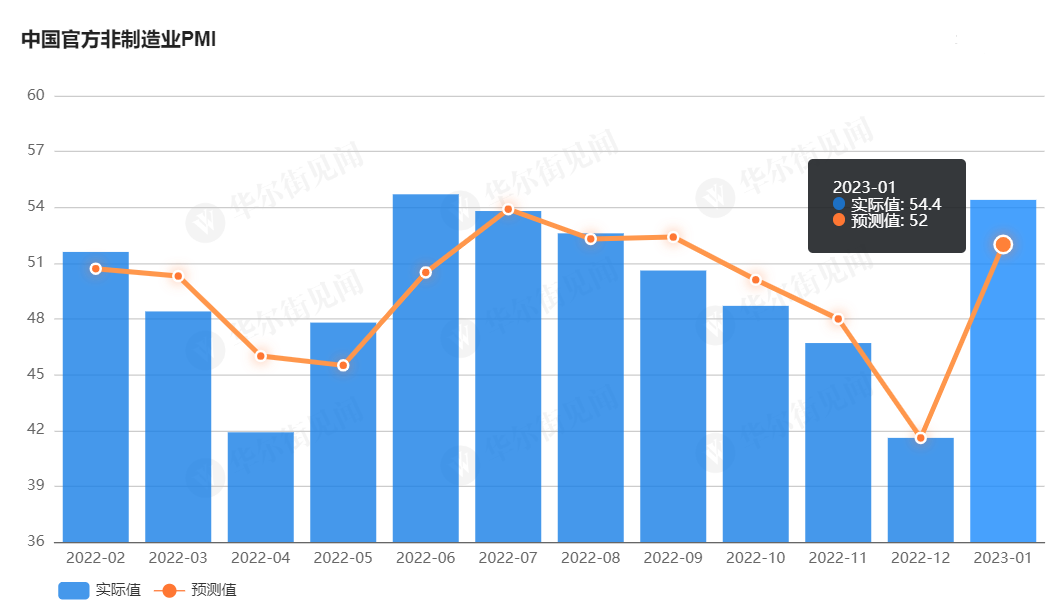 1 月非制造业 PMI 数据为 54.4%,高于预期值 52%,相比前值 41.6% 大幅增长了 12.8%。