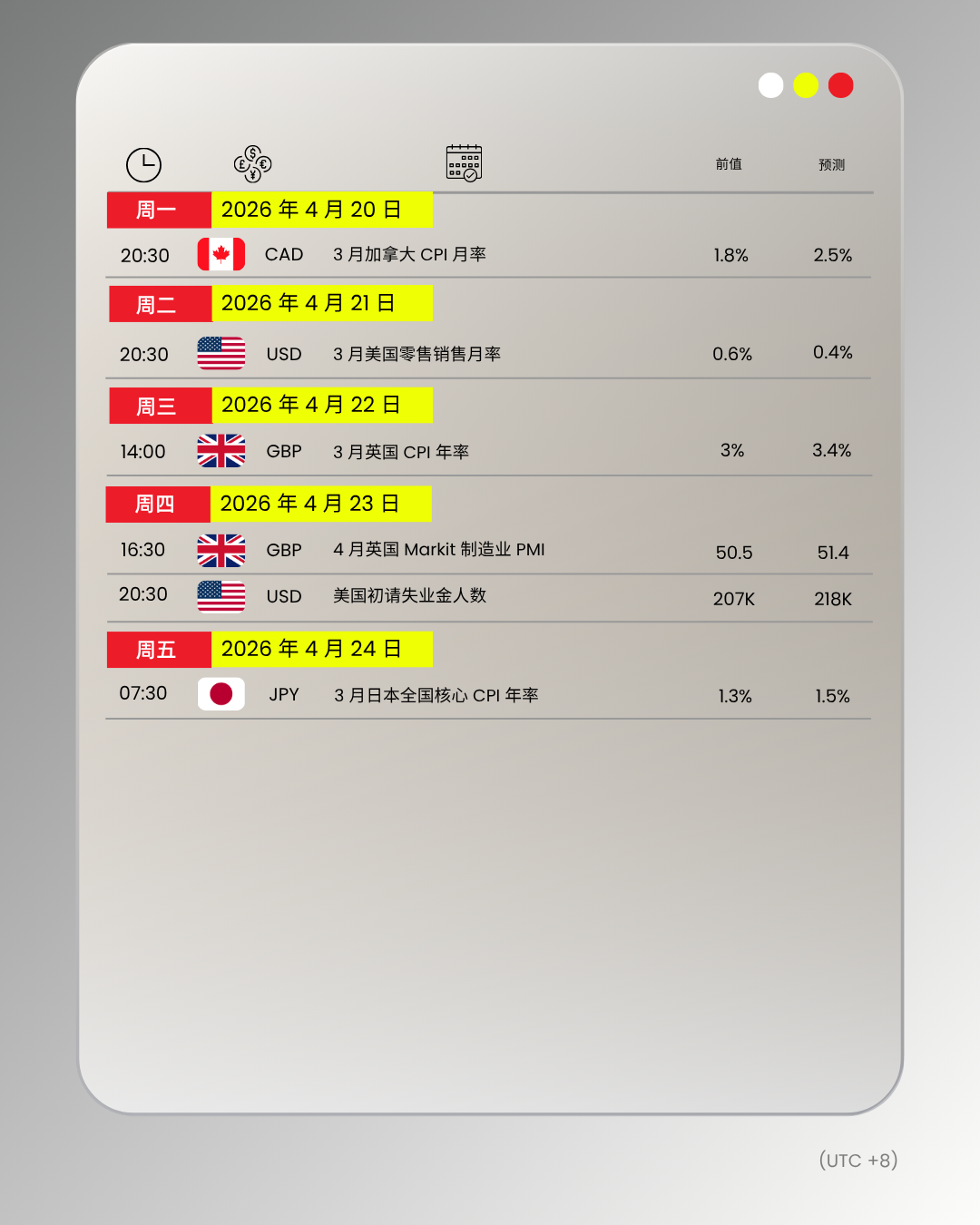 财经日历 | 以下为 2026 年 4 月 20 日至 2026 年 4 月 24 日(GMT+8 北京时间) 全球重大经济事件提醒。在重大行情期间,请确保您已审查您的保证金率,并有足够的保证金来支撑您的风险敞口。