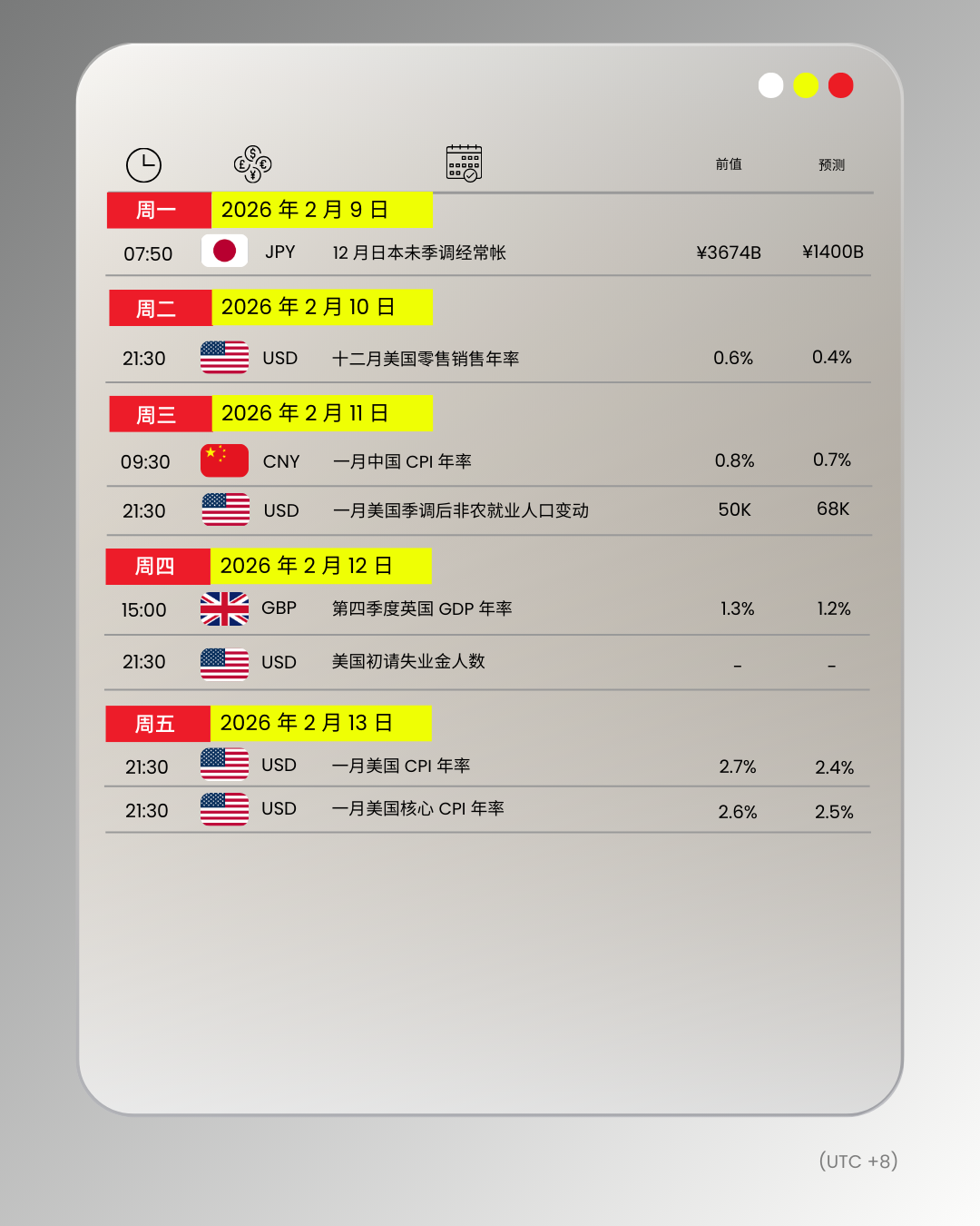 财经日历 | 以下为 2026 年 2 月 9 日至 2026 年 2 月 13 日(GMT+8 北京时间) 全球重大经济事件提醒。在重大行情期间,请确保您已审查您的保证金率,并有足够的保证金来支撑您的风险敞口。