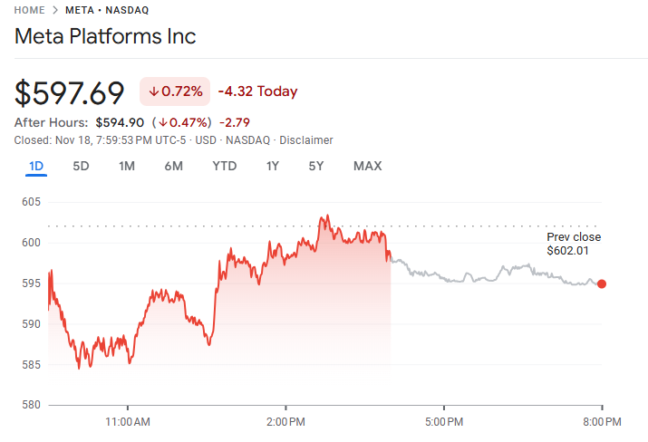 11 月 18 日至 19 日,Facebook 母公司 Meta 在一宗关键反垄断诉讼中获胜。美国华盛顿地方法院法官詹姆斯·博斯伯格(James Boasberg)裁定,美国联邦贸易委员会(FTC)未能证明 Meta 通过收购 Instagram 与 WhatsApp 实现了对社交网络市场的非法垄断,因此驳回 FTC 的指控。Meta 股价收窄跌幅,收报 597.69 美元,下跌 0.72%。