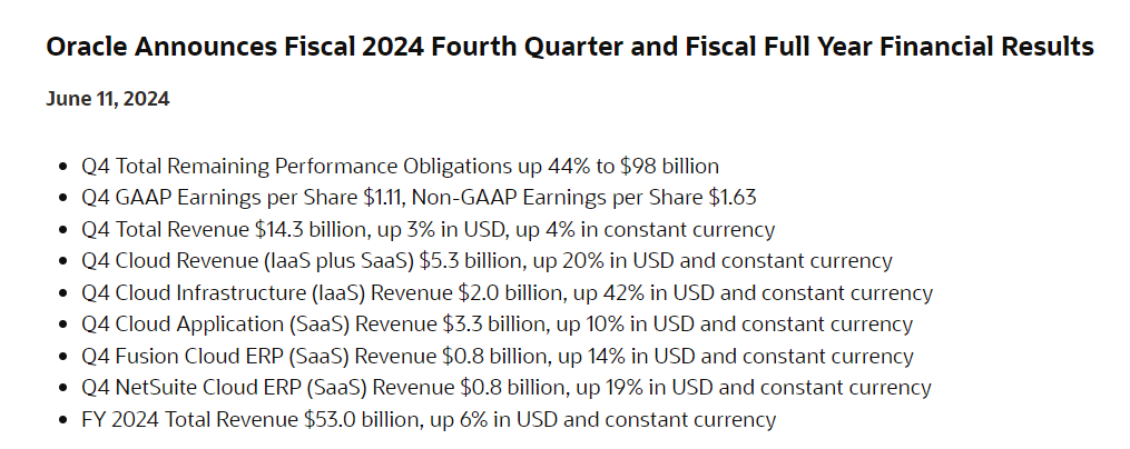 甲骨文(Oracle)发布了其 2024 财年第四季度的业绩报告,其中云计算部门在本季度表现强劲,反映了市场对甲骨文出租计算能力和存储服务的强烈需求。其他第四季度财报重点如下: