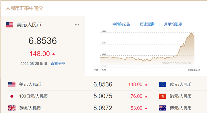 人民币兑美元汇率在在岸市场续创近两年新低。8 月 24 日,人民币兑美元即期汇率以 6.8430 高开,盘中最高升至 6.8415,随后人民币兑美元即期汇率走低,接连跌破 6.85、6.86 关口,盘中最低贬值至 6.8680,创下 2020 年 8 月末以来的新低。
