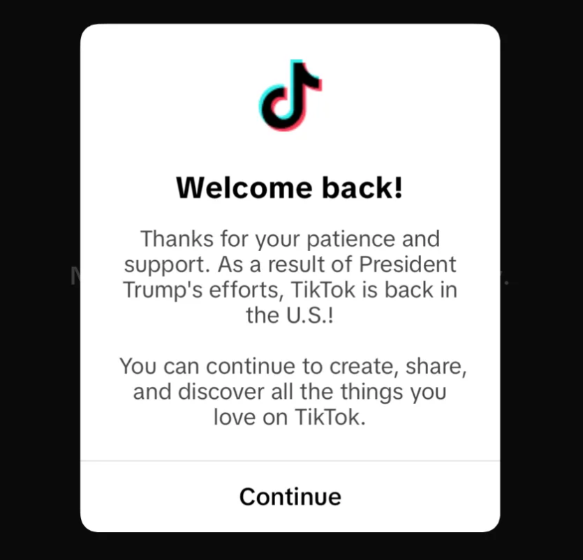 1 月 18 日晚间,TikTok 发送弹窗通知,称“非常遗憾美国法律将在 1 月 19 日禁止 TikTok 在美国提供服务”,并表示“TikTok 正在努力尽快恢复在美国提供服务”。1 月 19 日,许多 TikTok 的美国用户发现,前一晚因禁令下线的 TikTok 又可以重新使用。