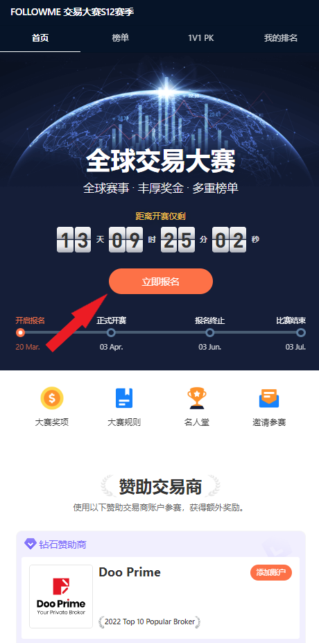 大赛开战在即,汇聚行业精英,切磋交易技术更有丰厚奖金鼓励,机会难得不容错过。现 FOLLOWME S12 交易大赛报名通道已极速开启,来 Doo Prime 立即开户,一起赢得 2023 无限机遇与挑战。