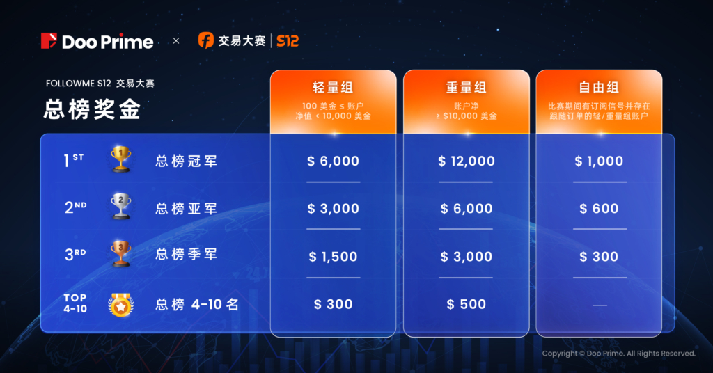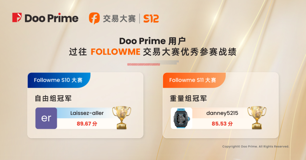 Doo Prime 再次作为 FOLLOWME 交易大赛的钻石赞助商,除了奖金与荣誉的吸引,也是平台及业内对 Doo Prime 的高度肯定。2023 年 Doo Prime 蓄势待发,始终将客户利益放在首位,力争为投资者提供良好的交易环境,严格遵守权威机构监管规范,保障客户资金财产安全;全面提供过万种交易产品,汇集 500 多位行业精英打造顶级团队,为客户提供全年  365 天不间断式专业服务;依托 Doo Prime 金融创新技术发展,实现极速交易,并以 0.1 pips 超低点差及 1:1000 优势杠杆,赋能投资者以低成本撬动大机会。Doo Prime 将以自身的全面优势,助推广大参赛客户,在 S12 交易大赛中再创佳绩。