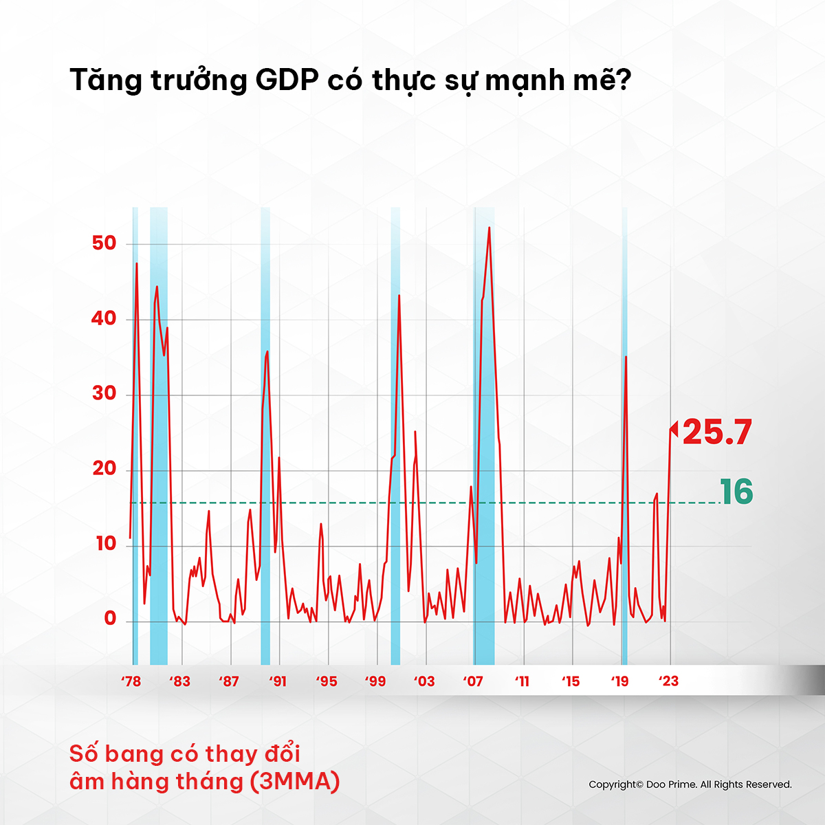 Theo tiền lệ, khi sự chênh lệch tăng vượt mức 0.20%, đó là một dấu hiệu cảnh báo suy thoái. Hiện tại, chúng ta đang ở mức 0.18%, một con số đáng ngại. Mặc dù chưa chạm vùng suy thoái, nhưng những con số này đã cho thấy phần nào sự khó khăn của thị trường việc làm hiện tại.
